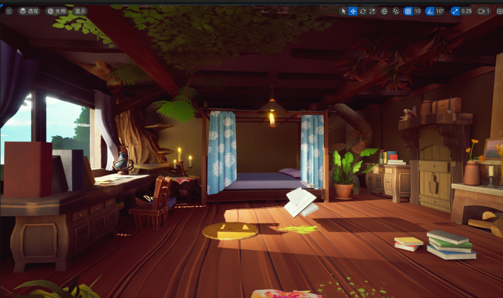 Inside the second house, I want to make a warm picture, so the overall colour tone is warm, I will import the model from Maya into UE5, and add the suitable material to set the overall colour tone as yellow, and most of the furniture is made of wooden material, at first, I will make the material of the ceiling and the floor, so that the style of the whole room is more or less the same, I opened a window on the left side of the room, so that the sunlight can be called to spill down and just shine into the bedside, which is in line with the story, the old man will wake up the child. I opened a window on the left side of the room, so that the sunlight can shine into the side of the bed, which is in line with the story, the old man will wake up the child’s picture, in the room, I added some novel ideas, the tree and the house grow together, and there are some mushrooms on the tree, which makes the picture more playful and vivid, the sunlight outside the room is a very important part of the picture, which makes the picture look full of vitality and warmth, I will put the character model with the textures into the scene to adjust the matching textures. I put the character model with the texture into the scene and adjusted the colour to match it, so as to make the scene more harmonious. When making the texture of the scene, I need to pay extra attention to the difference in colour and pattern between different woods, if they are too similar, they will be blended together, and in the house, I also added some plants for embellishment. And when I finally adjusted it, I found that there was too much clutter in the neighbourhood, which didn’t really help much, so I did some subtractions.