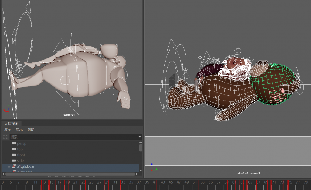I followed the original animation by making reference to the previous animation sketches, which made it easier for me to control the movement and timing. I put the original model movement on the left as a reference and selected the keyframes for each stitch, and then made the same movement on the same part, and then modified and adjusted the curves after completing the Blocking. All the model movements were done in this way. While working on the bear, I realised that his joints were not as flexible as those of a normal humanoid and were a bit bulky.